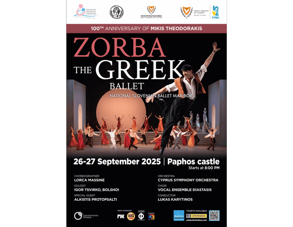 For the first time in this millennium, the world-renowned ballet “Zorba the Greek” comes to life in Cyprus in a breathtaking open-air production at the majestic Pafos Medieval Castle — featuring a live symphony orchestra, full chorus, and international ballet stars. Join over 150 performers for two unforgettable nights under the Mediterranean sky, where music, dance, and Greek soul unite in one of the island’s most iconic settings.